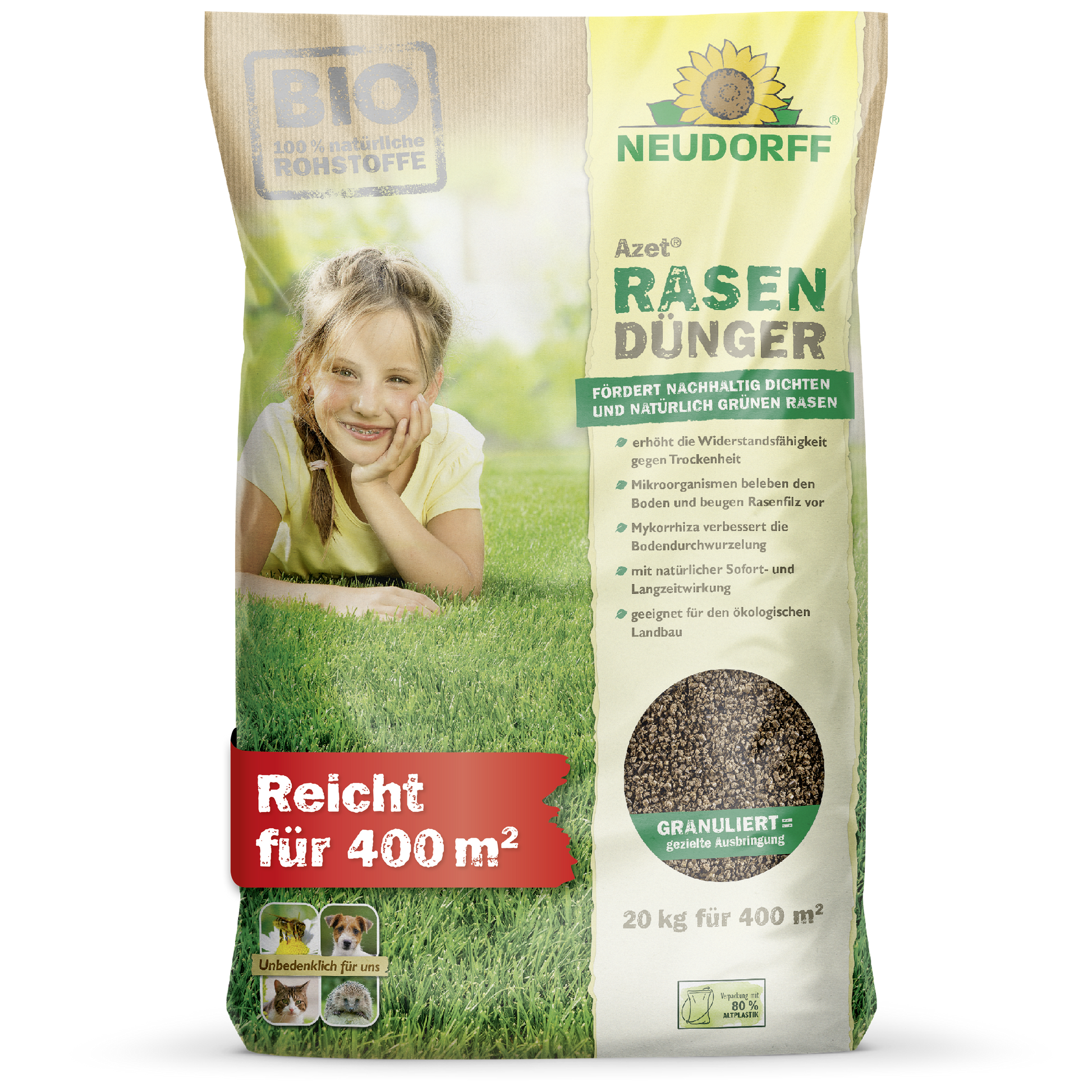 Azet RasenDünger ist ein organischer NPK-Dünger 8-3-4. Der Dünger enthält natürliche Mykorrhiza-Pilze und verschiedene Bodenbakterien. Mykorrhiza-Pilze verbinden sich mit Pflanzenwurzeln und vergrößern deren Oberfläche um ein Vielfaches. Dadurch wird eine höhere Wasser- und Nährstoffaufnahme aus den tieferen Bodenschichten sichergestellt. So hilft Mykorrhiza bei Trockenheit und ernährt die Pflanze zusätzlich.