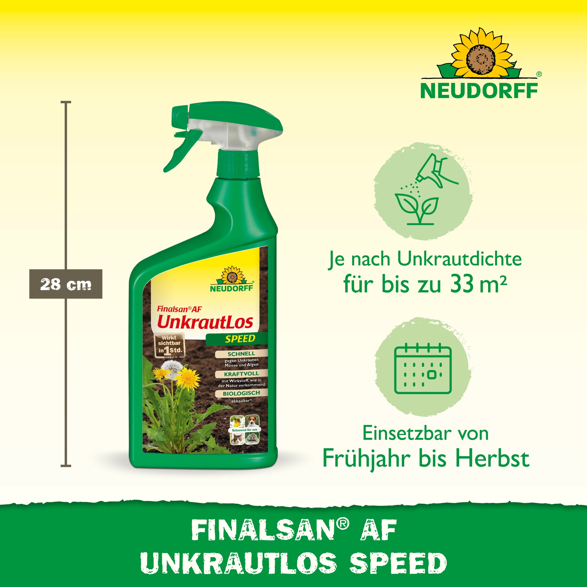Finalsan AF UnkrautLos Speed beseitigt schnell Unkräuter, Moose und Algen – ganz ohne Glyphosat! Der Wirkstoff ist eine Fettsäure, wie sie auch in der Natur vorkommt. Die Pelargonsäure zerstört die Zellwände der grünen Pflanzenteile und sorgt für die schnelle Wirkung. Finalsan AF UnkrautLos Speed ist sogar bei niedrigen Temperaturen gut wirksam. Daher kann es vom zeitigen Frühjahr bis zum späten Herbst eingesetzt werden.