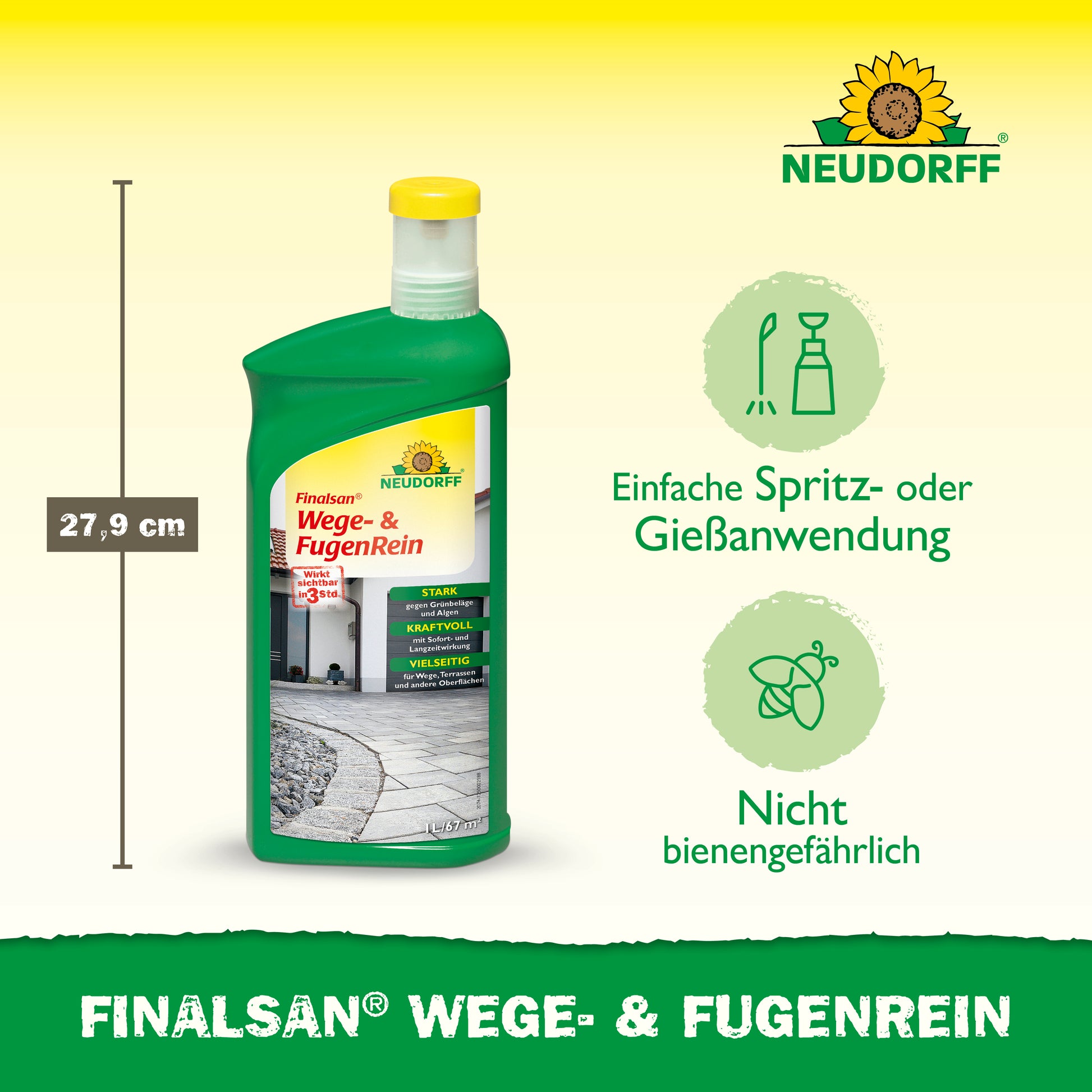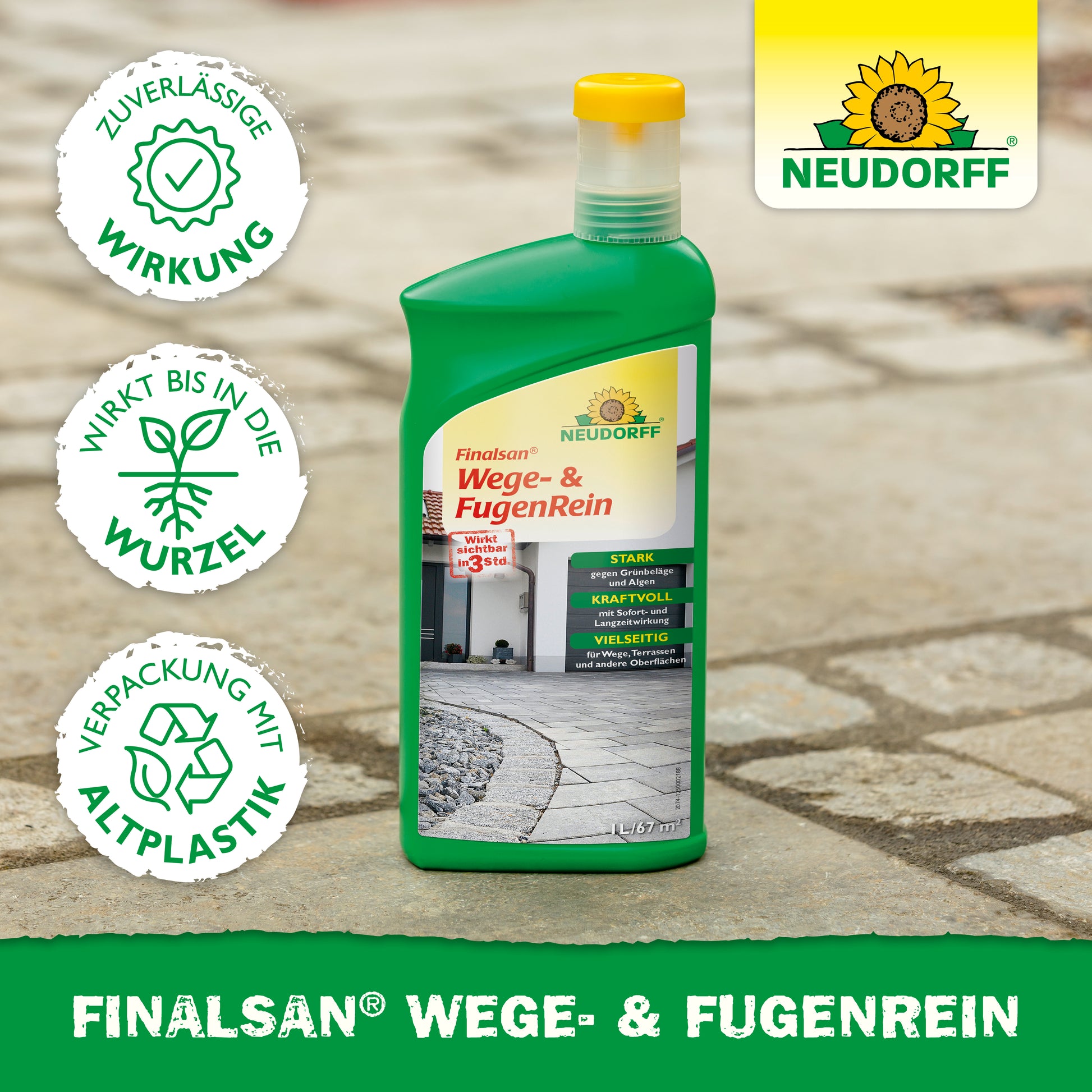 Algen und andere Grünbeläge auf Wegen können zu Materialschäden führen oder eine Rutschgefahr darstellen! Finalsan Wege- & FugenRein ist ein kraftvolles Reinigungskonzentrat aus Fettsäuren, wie sie auch in der Natur vorkommen. Zur Beseitigung von Grünbelägen auf Wegen, Terrassen und Mauern. Selbst hartnäckige Beläge werden gelöst. Finalsan Wege- & FugenRein wirkt schon nach wenigen Stunden, beugt langfristig der Neubildung von Grünbelägen vor und ist biologisch abbaubar. Wenden Sie Finalsan Wege- & FugenRein auf Oberflächen aus Holz, Terracotta, Stein, Glas, Kunststoff oder Metall an. Der kraftvolle Reiniger weist eine gute Materialverträglichkeit auf. In Einzelfällen können auf dunklen Materialien nach der Anwendung weißliche Beläge auftreten, die aber nach Regenfällen rasch wieder verschwinden. Kontakt mit Kunstharzplatten, kupfer- oder zinkhaltigen Oberflächen vermeiden. Bei anderen Materialien, wie z.B. Marmor, Verträglichkeit an verdeckter Stelle prüfen. Bei Kontakt mit Messingteilen kann es zur Ausbildung von Belägen kommen.