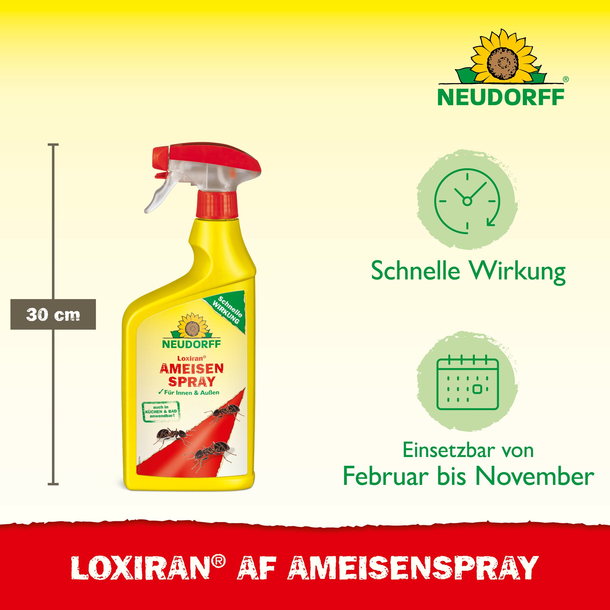 Wirkt schnell und zuverlässig. Dies beruht auf dem enthaltenen Wirkstoff Pyrethrum, der aus Chrysanthemenblüten gewonnen wird. Setzen Sie Loxiran AF AmeisenSpray nicht in der Nähe von Nahrungsmitteln, also z. B. im Vorratsregal, ein. Behandeln Sie Schlupfwinkel und Eintrittsstellen intensiver. Prüfen Sie an verdeckter Stelle die Materialverträglichkeit. Das Spray kann zu Ölflecken auf Tapeten, Fußböden und Gegenständen führen. Im Außenbereich die Ameisennester sowie ameisenbefallene Ritzen und Fugen direkt einsprühen. Nicht an Pflanzen oder Pflanzenerzeugnissen anwenden.