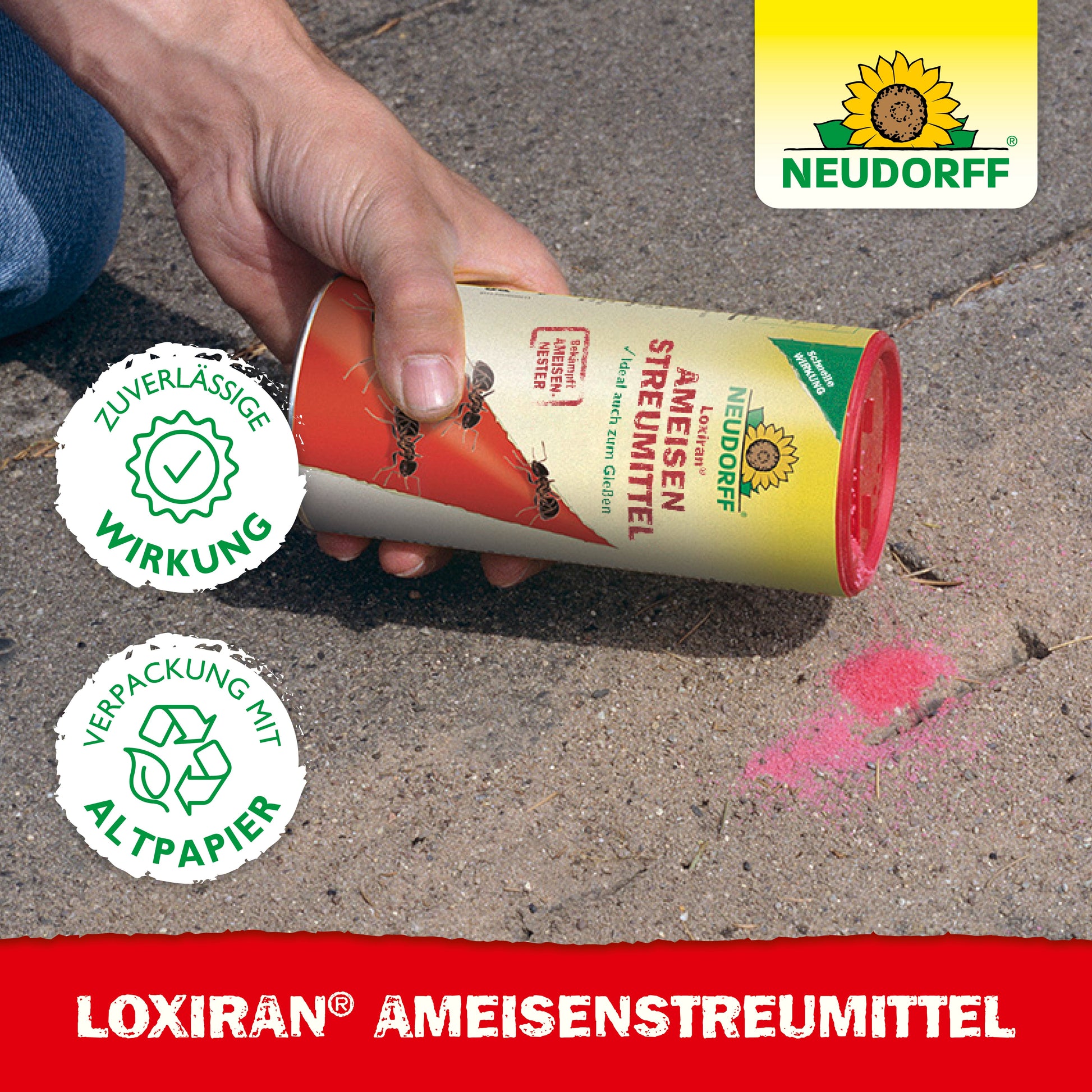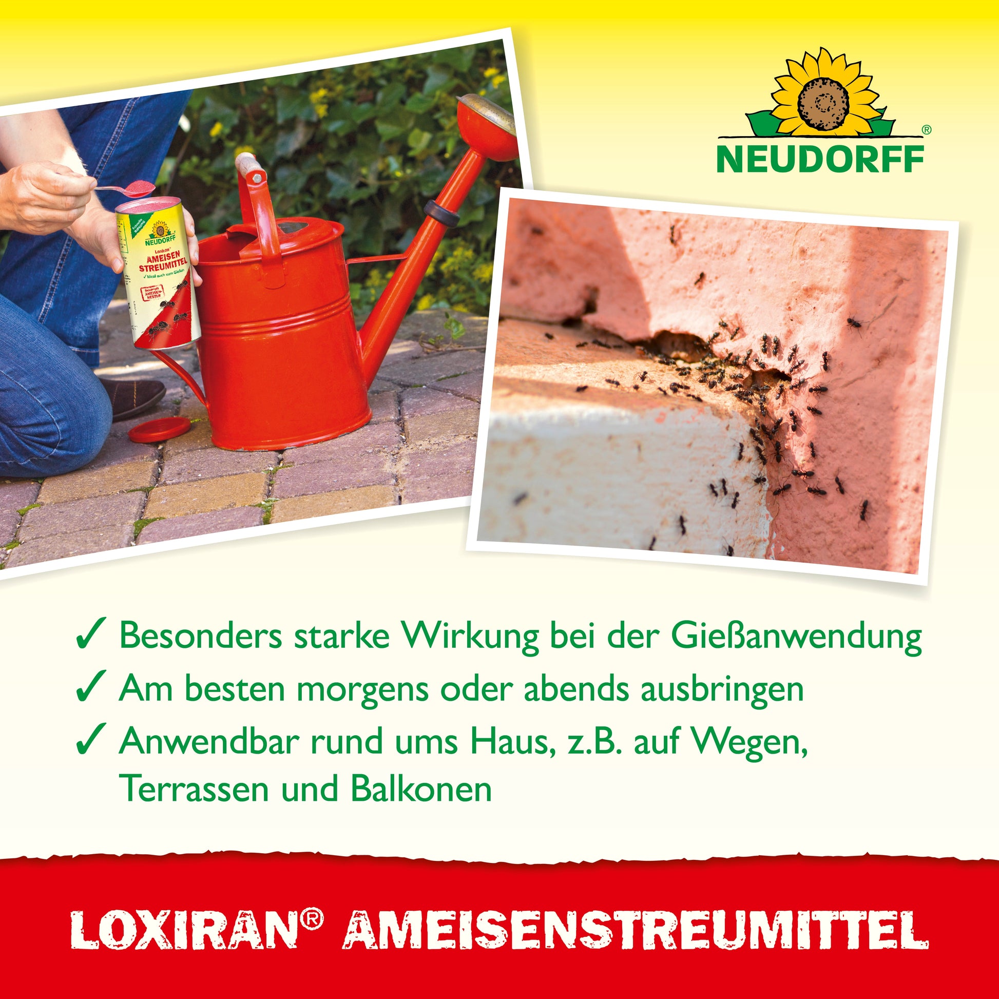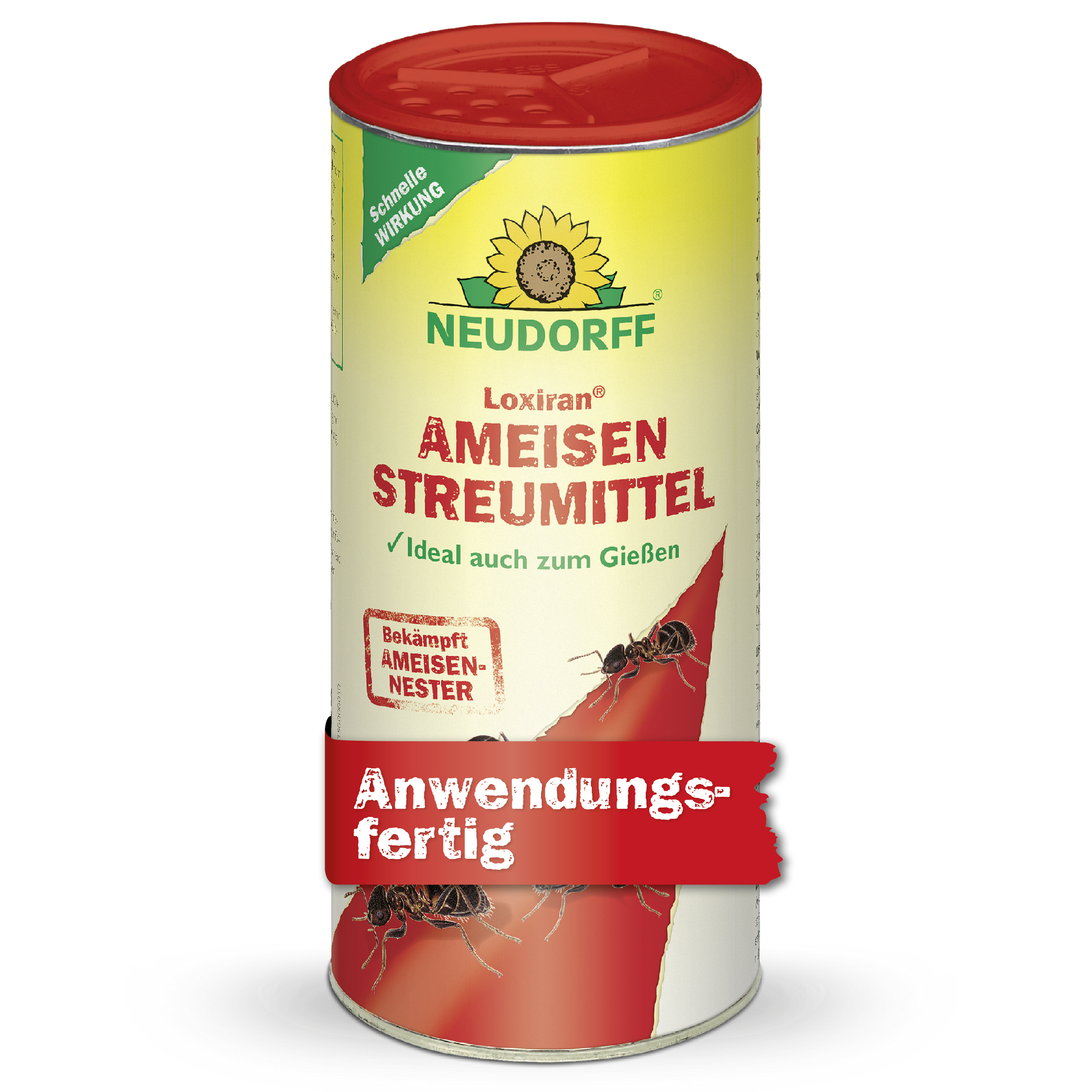 Das Produkt kann trocken aus der Dose gestreut oder in Wasser gelöst mit einer Gießkanne ausgebracht werden. Am stärksten wirkt Loxiran AmeisenStreumittel gegen Ameisen, auch im Nest, wenn die Wirkstofflösung gegossen wird. Im Nest kommt die Flüssigkeit mit den Ameisen in Berührung, die keinen Zugang zur Oberfläche haben. So werden die Ameisen nachhaltig bekämpft.