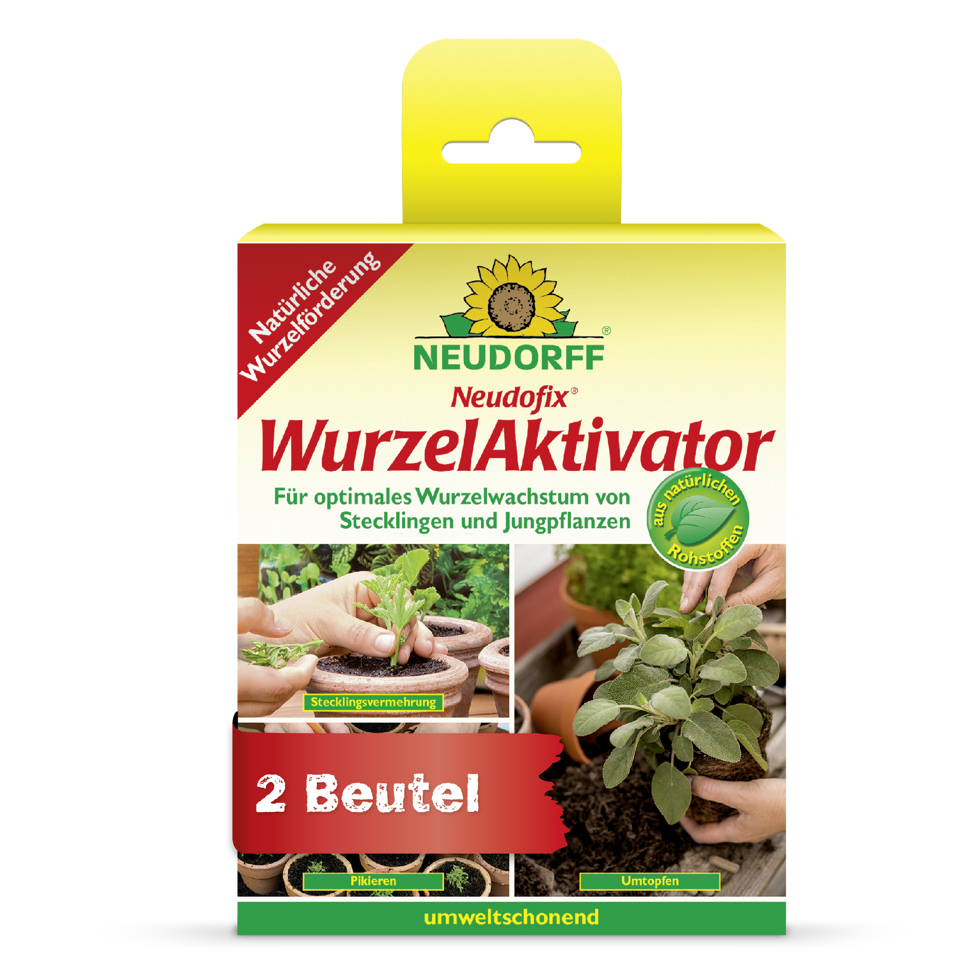 Entweder: Neudofix WurzelAktivator in Wasser lösen (gut rühren) und Pflanzen gießen. Ein 20 g Beutel reicht für 5 Liter Wasser.