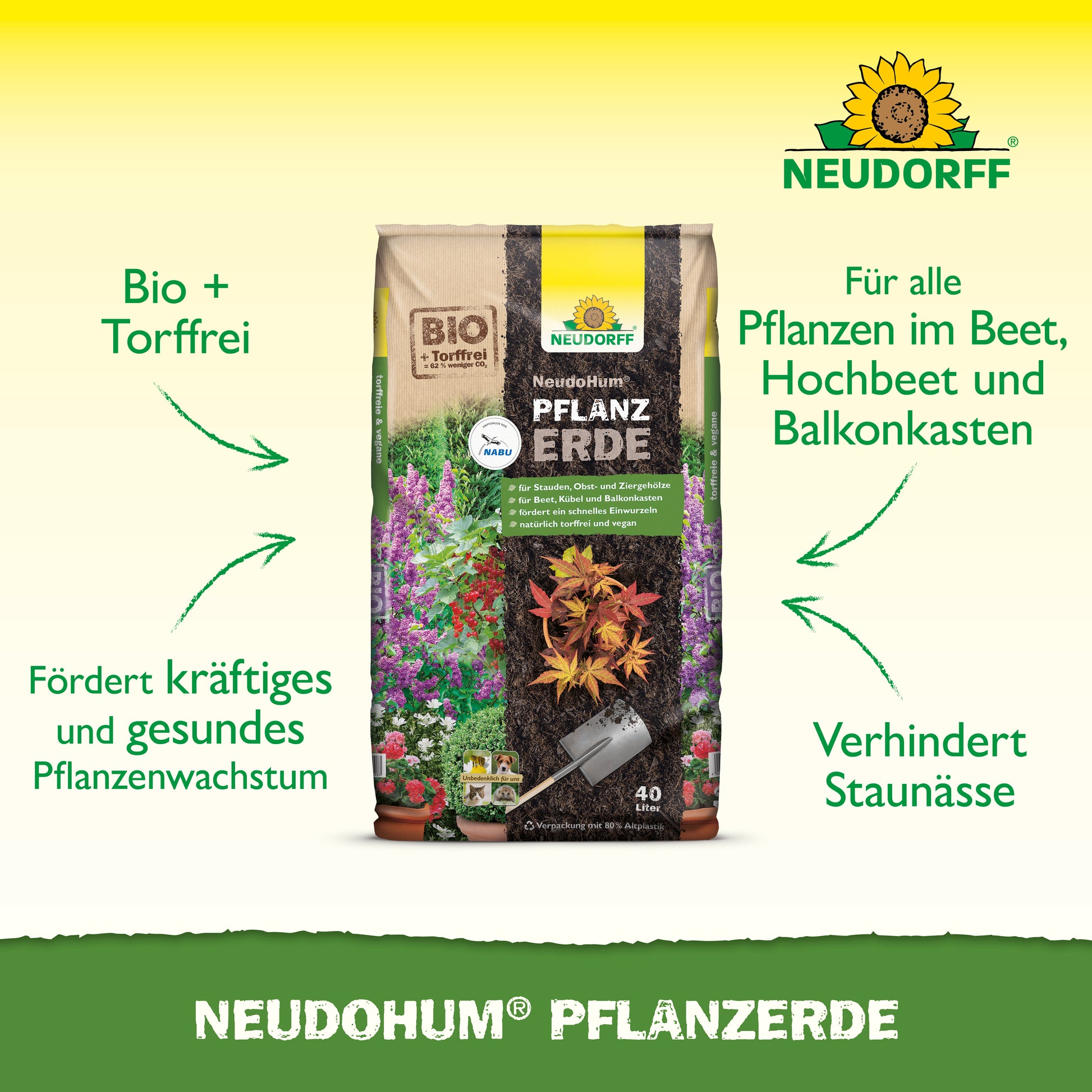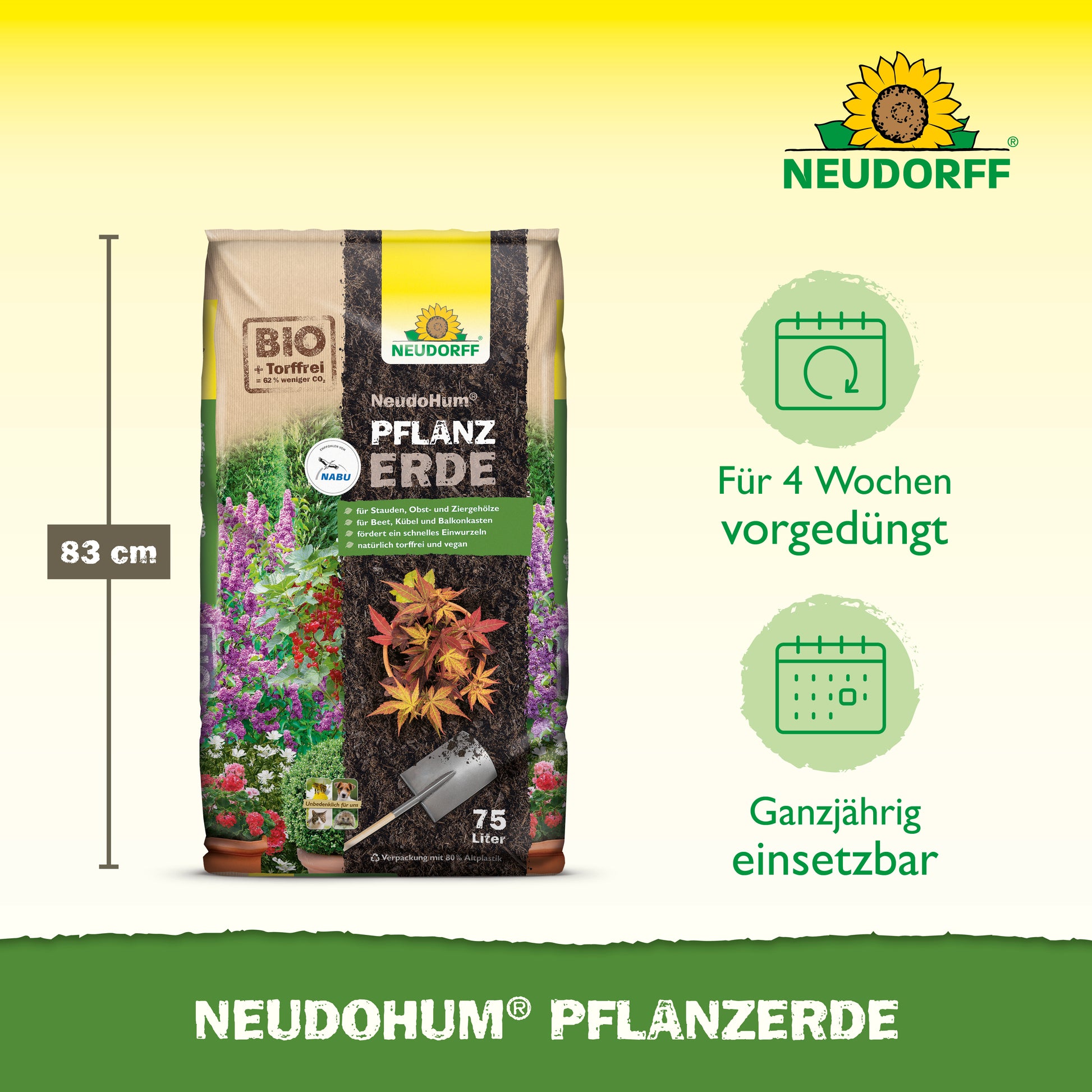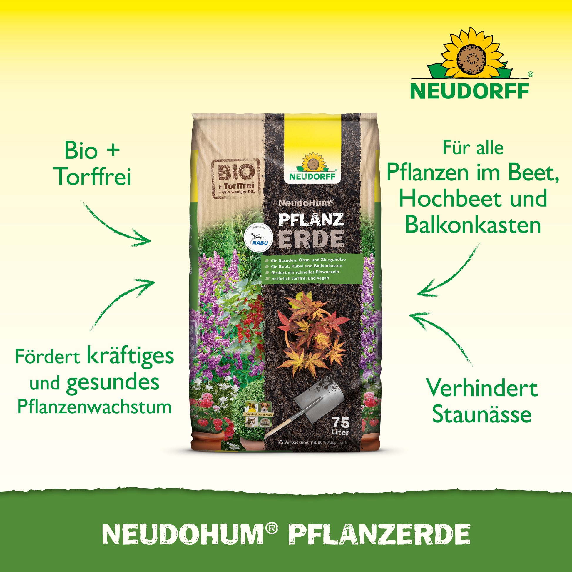NeudoHum PflanzErde bietet das, was die Pflanze braucht! Sie sorgt für schöne Pflanzen, gesundes, aromatisches Obst, Gemüse und Kräuter. NeudoHum PflanzErde ist für alle Pflanzen im Beet, Hochbeet, Kübel und Balkonkasten geeignet. Das Pflanzsubstrat verbessert die Bodenqualität durch die Zufuhr von organischem Material und Mikroorganismen und fördert damit ein kräftiges und gesundes Pflanzen- und Wurzelwachstum. NeudoHum PflanzErde optimiert den Wasser- und Lufthaushalt im Boden, verhindert Staunässe und sorgt für eine gleichmäßige Wasserverteilung, da die Erde durch ihre lockere Struktur gut durchlüftet wird. NeudoHum PflanzErde enthält einen organischen Dünger, der Ihre Pflanzen 3-4 Wochen lang mit Nährstoffen versorgt. Sie ist unbedenklich für Mensch und Tier.