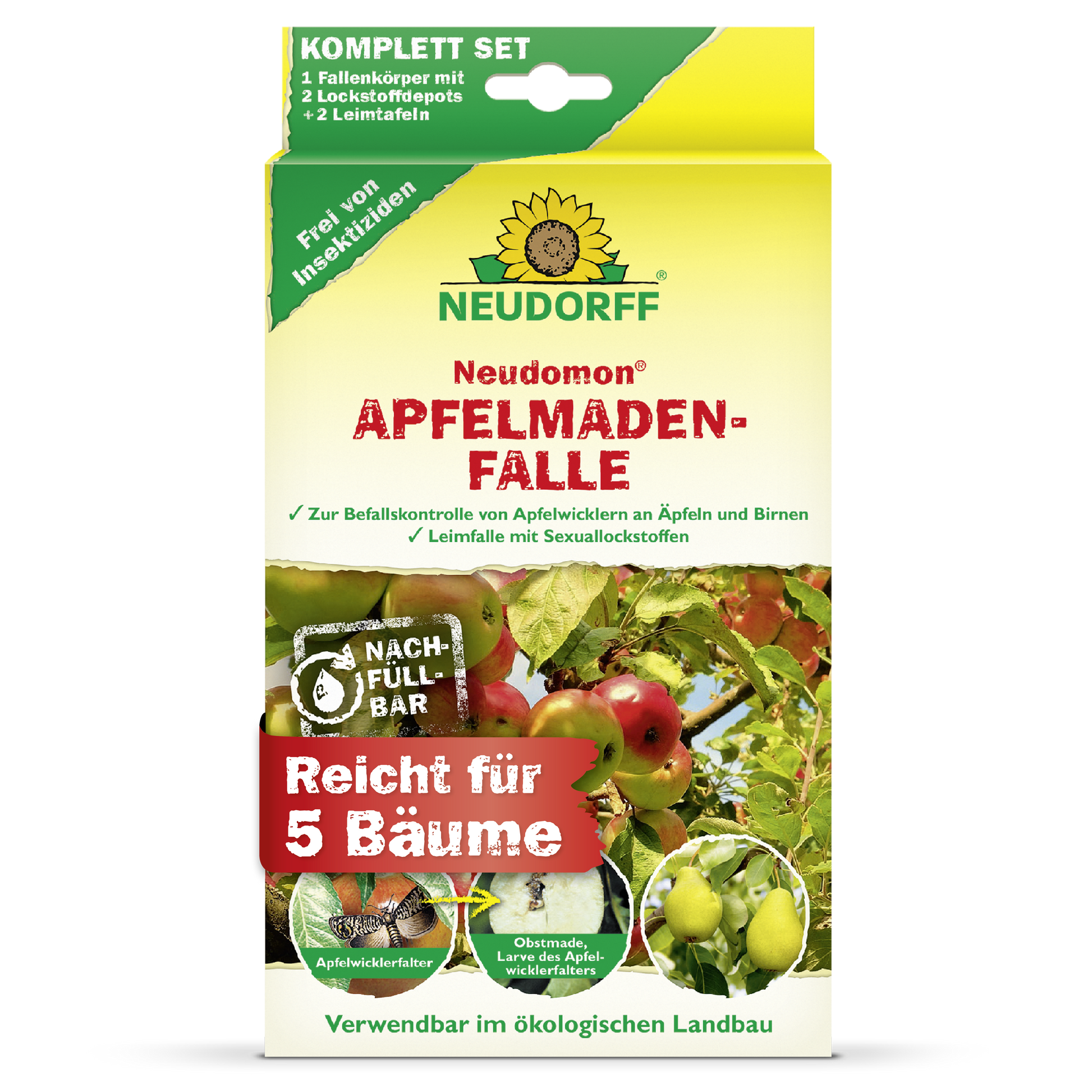 Die Neudomon ApfelmadenFalle ist eine Insektizidfreie Falle mit Spezialleim zur Befallsfeststellung (Monitoring) des Madenbefalls in Äpfeln und Birnen. Obstmaden in Äpfeln und Birnen sind die Nachkommen (Larven) des Apfelwicklers (Cydia pomonella). Dieser nachtaktive Kleinschmetterling legt seine Eier an die Früchte, aus denen sich dann die Maden entwickeln. Diese bohren sich in die Früchte und verursachen das Schadbild der „wurmigen“ Äpfel bzw. Birnen.