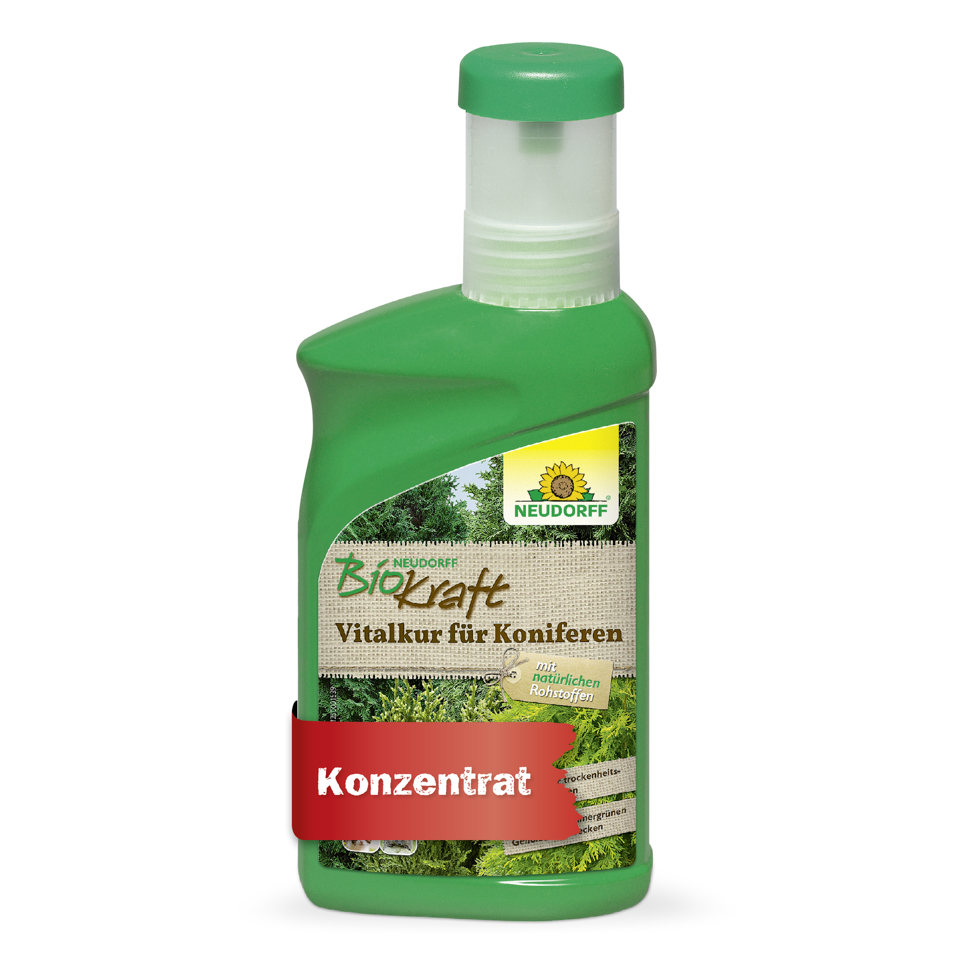 Neudorff BioKraft Vitalkur für Koniferen & Immergrüne mehrmals 0,3-1 %ig, je nach Zustand der Pflanzen, d.h.15-50 ml auf 5 Liter Wasser, spritzen. Kann ganzjährig gespritzt oder auch gegossen werden.