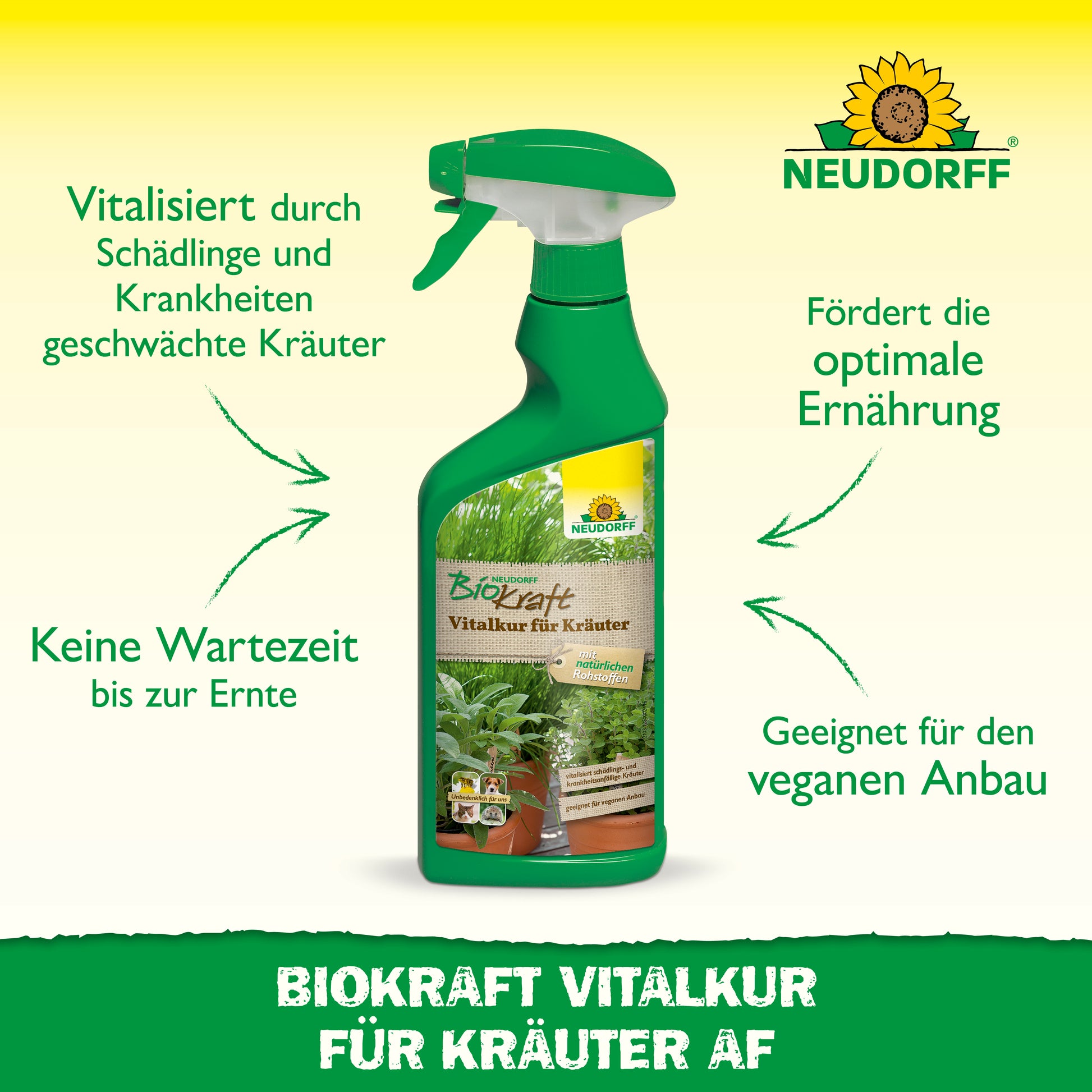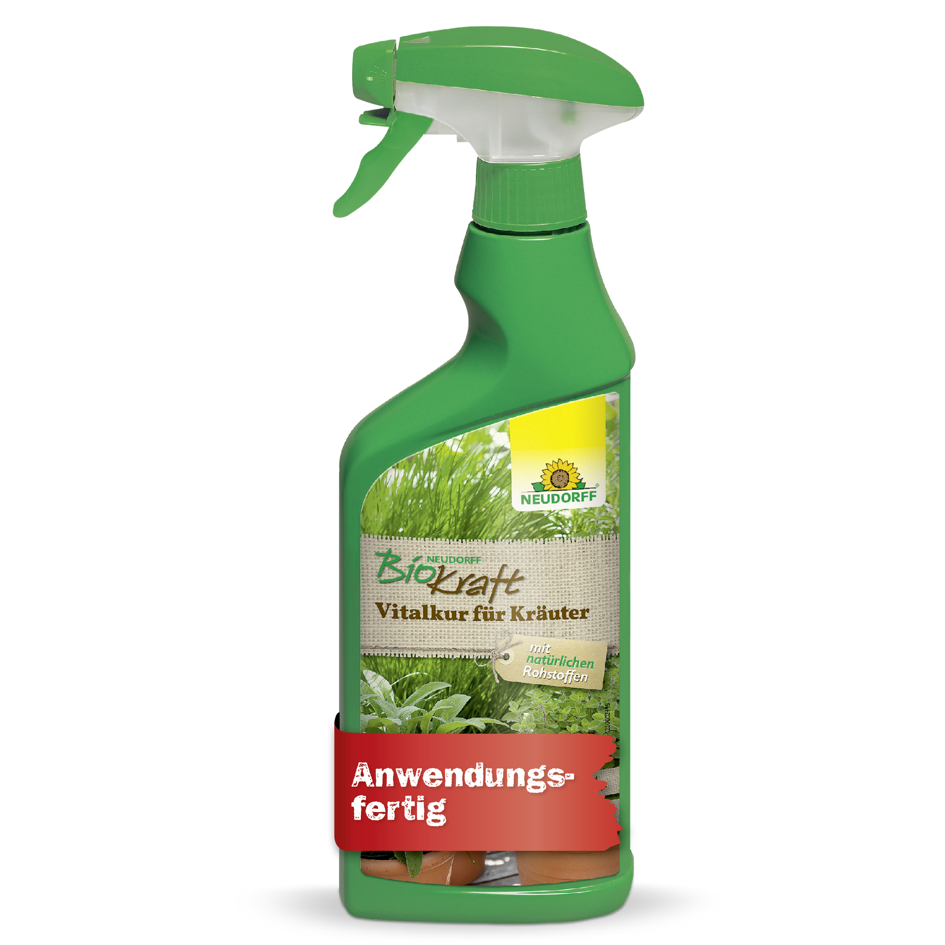 Die anwendungsfertige Neudorff BioKraft Vitalkur für Kräuter besteht aus spurenelementreichen Pflanzenextrakten. Sie vitalisiert schädlings- und krankheitsanfällige Kräuter und fördert die optimale Ernährung der Pflanze.