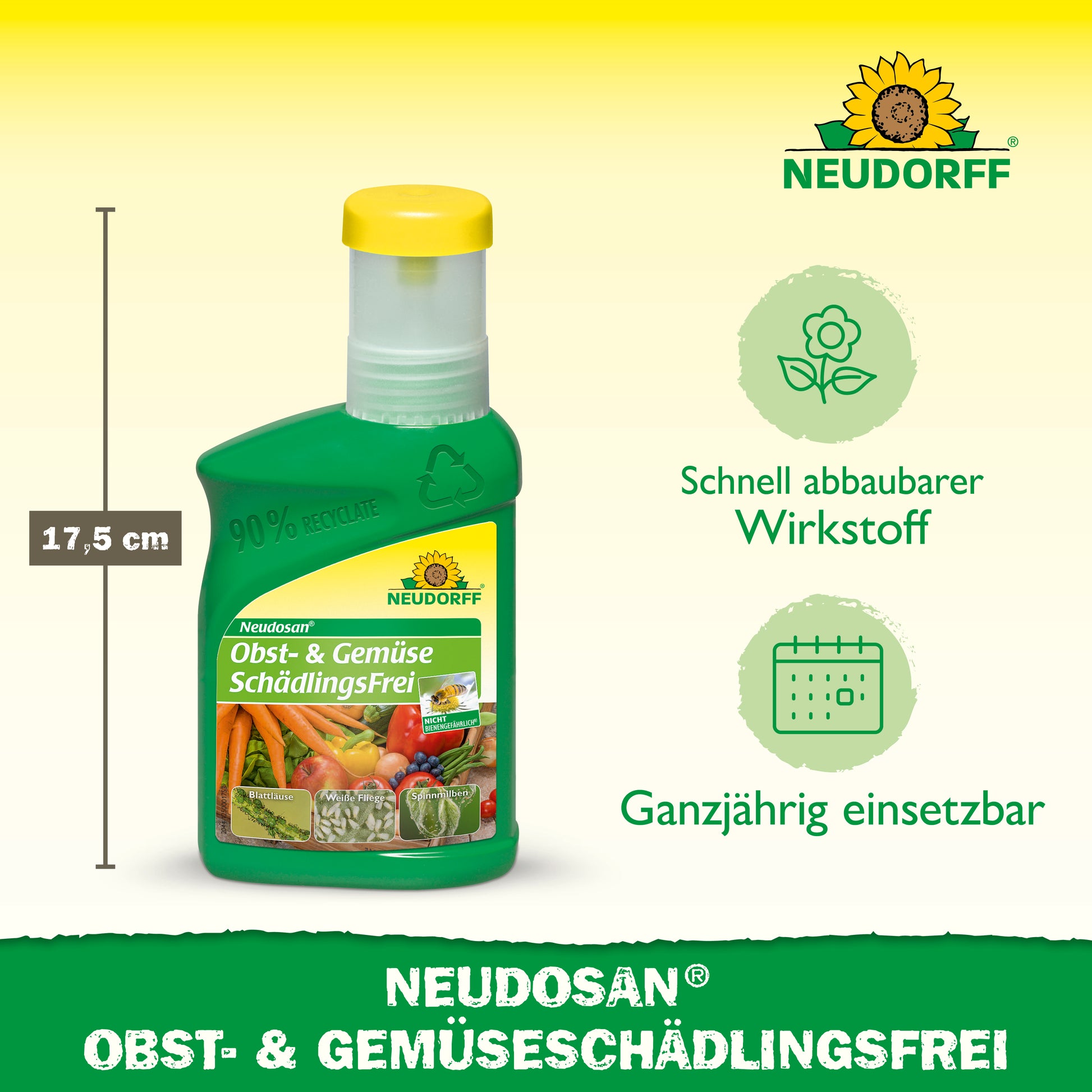 Neudosan Obst- & GemüseSchädlingsfrei ist ein Spritzmittel zur Bekämpfung von Blattläusen, Weißen Fliegen und Spinnmilben. Neudosan Obst- & GemüseSchädlingsFrei kann an Zierpflanzen, Kern-, Stein- und Beerenobst, Gemüse und Kräutern angewendet werden. Das Mittel enthält als Wirkstoff Salze natürlicher Fettsäuren, die in der Natur schnell abgebaut werden.