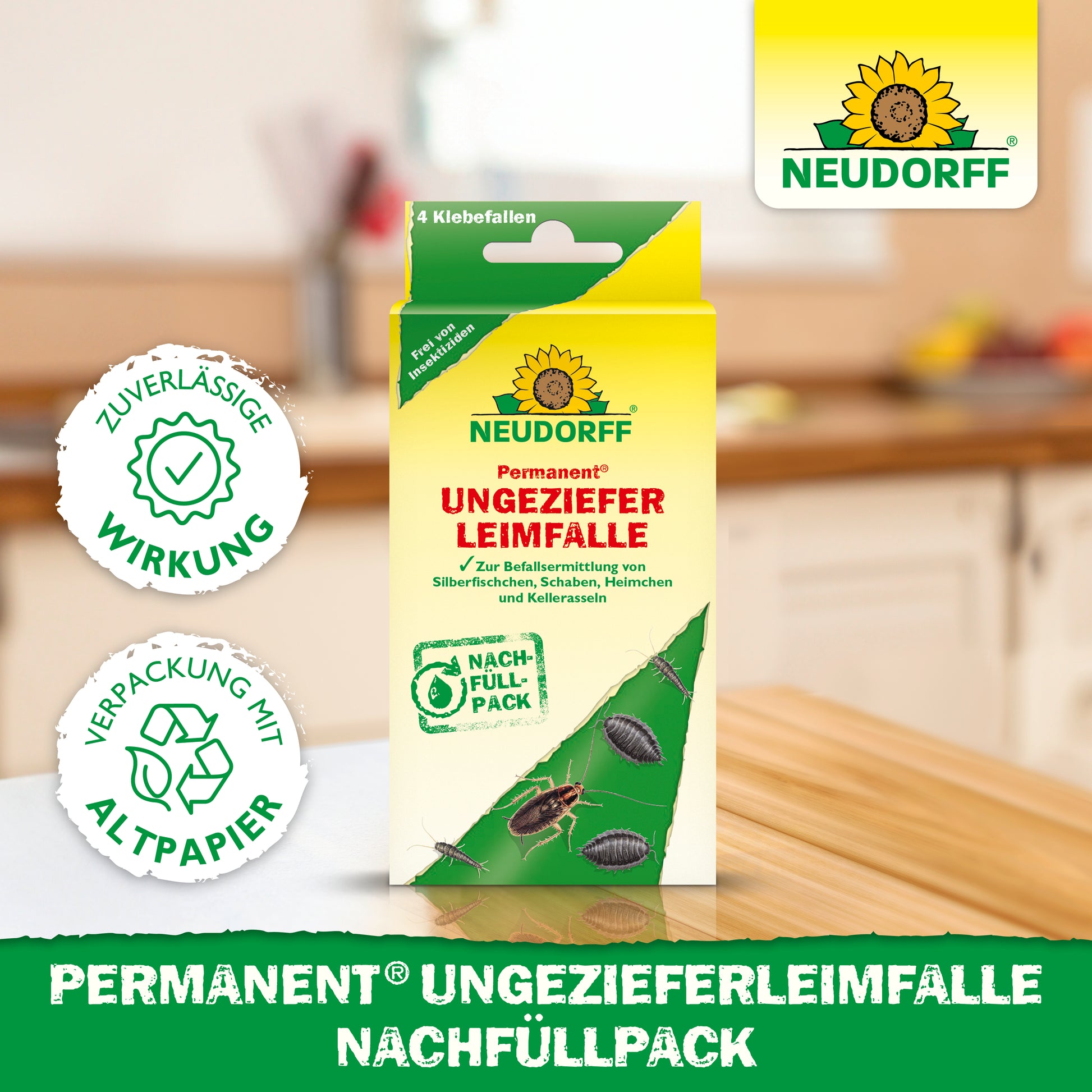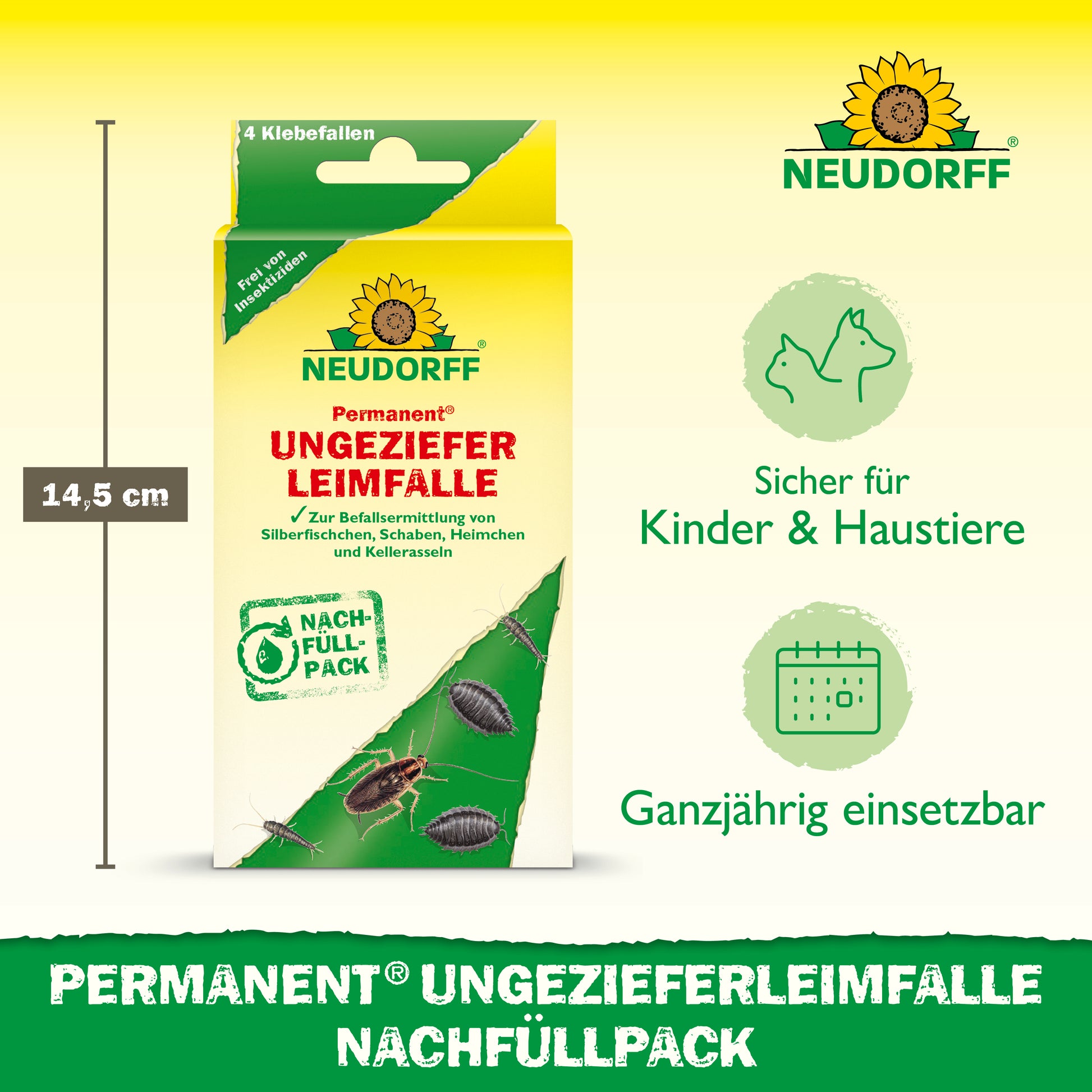 Einfach austauschen: diese beleimten Klebeböden helfen bei der Befallsermittlung von Haushaltsschädlingen wie Silberfischchen, Schaben, Heimchen und Kellerasseln in der Permanent UngezieferLeimFalle, die mehrfach verwendbar ist.