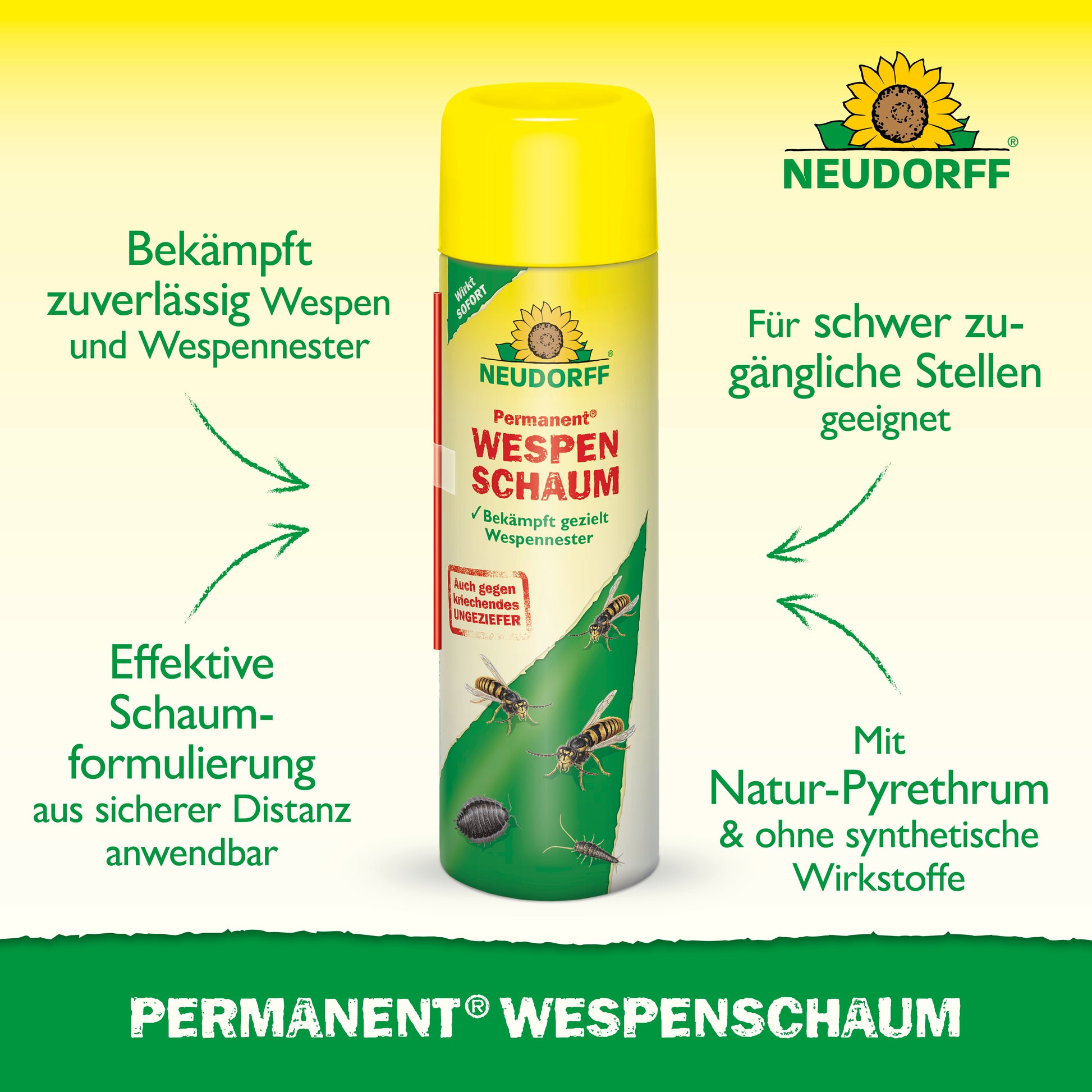 Permanent WespenSchaum ist mit der Schaumformulierung ideal für die gezielte Bekämpfung von Wespen in Nestern sowie anderen Insekten in schwer zugänglichen Hohlräumen. Das auf den Sprühkopf aufzusetzende Sprühröhrchen ermöglicht das zielgerichtete Ausschäumen von Einfluglöchern oder Zugängen von Verstecken hinter Hohlräumen, in Ritzen und Spalten. Der ausgebrachte Schaum bleibt mehrere Stunden stabil.