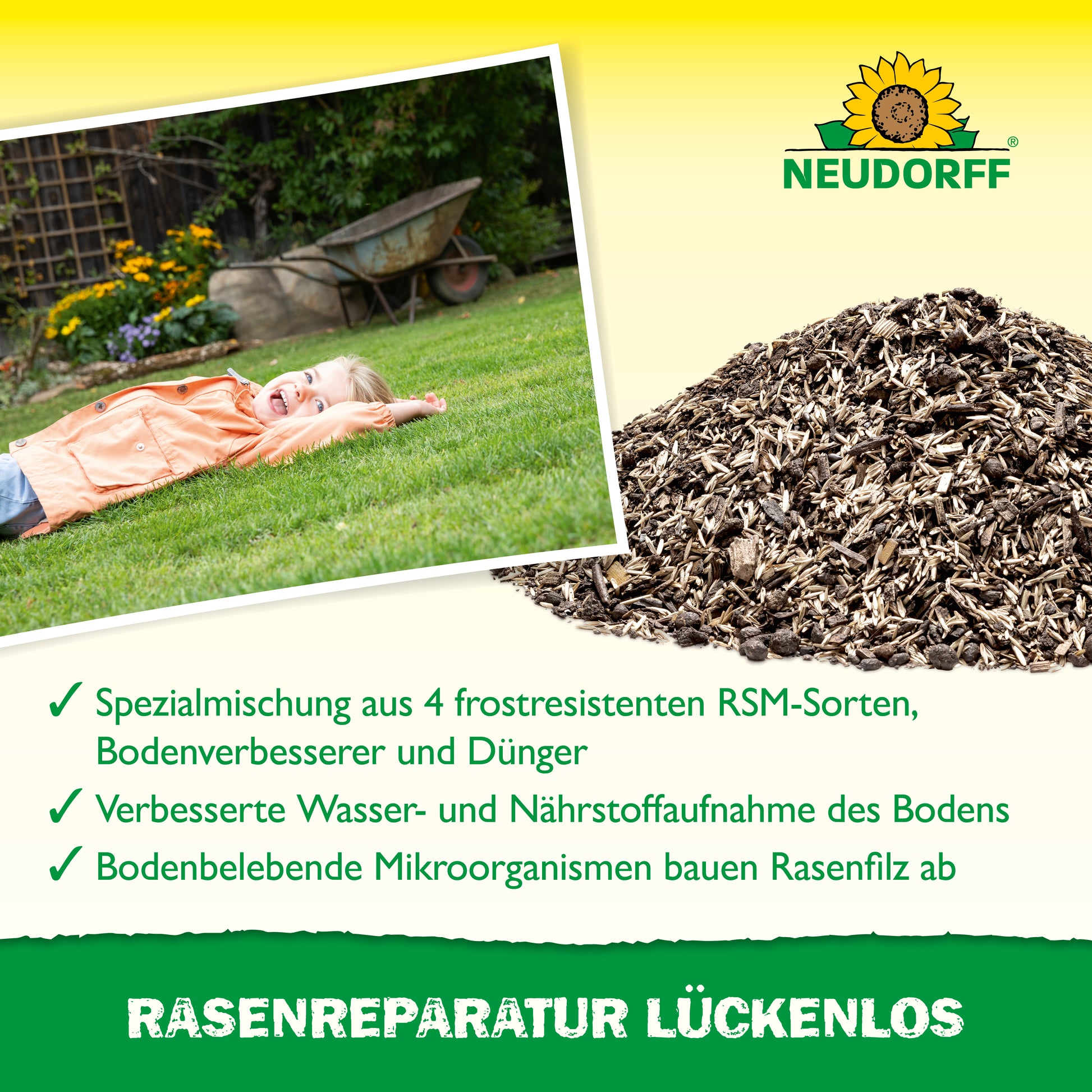 Die Rasenreparatur LückenLos enthält vier verschiedene schnellkeimende Top-Rasensorten, die zu jedem Rasen passen. Die Gräser wachsen in die Breite, sind strapazierfähig und frostresistent. Der Neudorff Terra Preta BodenVerbesserer speichert Nährstoffe und Wasser wie ein Schwamm und belebt dadurch ausgelaugten Boden sofort und verbessert ihn langfristig. Der 100% organische Dünger sorgt für sicheres und dauerhaftes Anwachsen der Keimlinge. Mykorrhiza-Pilze vergrößern die Wurzeloberfläche um ein Vielfaches. Die Rasengräser können dadurch Wasser und Nährstoffe besser aufnehmen. Bodenbelebende Mikroorganismen helfen, Rasenfilz abzubauen. Mit der Rasenreparatur LückenLos wird Ihr Rasen wieder ein saftig grüner, strapazierfähiger grüner Teppich ohne Lücken und Löcher.