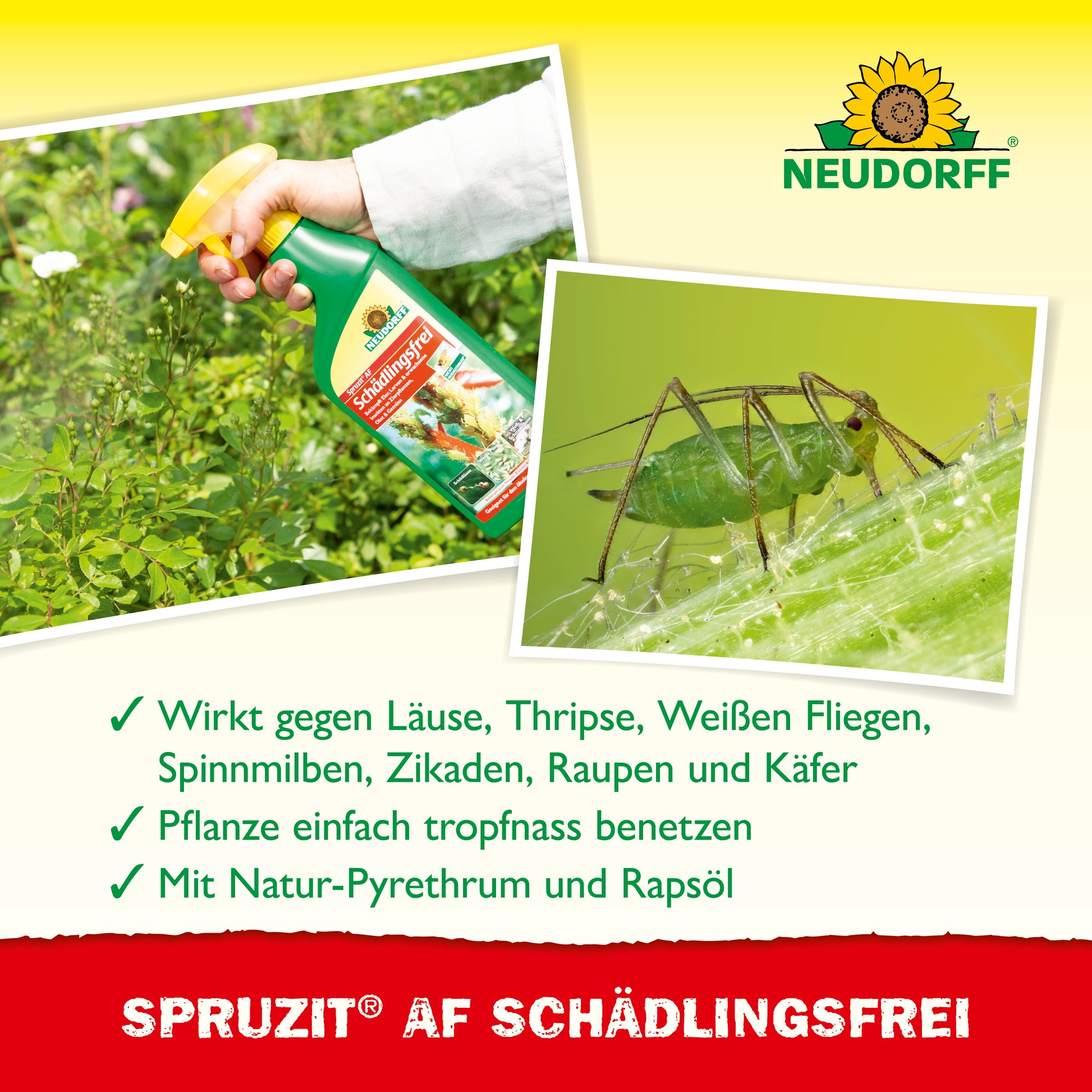 Spruzit AF Schädlingsfrei ist ein breit wirksames Spritzmittel zur Bekämpfung von saugenden Insekten wie Blattläusen, Thripsen, Weiбen Fliegen, Spinnmilben, Schildläusen, Woll-und Schmierläusen, Zikaden, Raupen, Käfern und Käferlarven, Blattwespenlarven und Wanzen an Zierpflanzen, Gemüse und Kräutern. Dadurch werden alle Entwicklungsstadien der Schadinsekten bekämpft. Spruzit AF Schädlingsfrei erfordert nach der Ausbringung nur eine kurze Wartezeit bis zur Ernte.