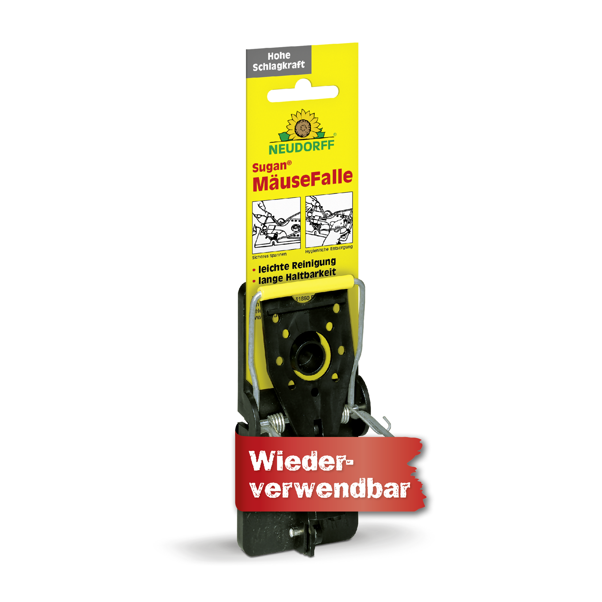 Mit der Sugan MäuseFalle fangen Sie Mäuse zuverlässig. Die aus Kunststoff und Stahl bestehende Falle lässt sich durch einfaches Herunterdrücken des Doppelbügels spannen. Durch Drücken des Spannbügels löst sich der Schlagbügel automatisch. Diese Mechanik ermöglicht ein besonders hygienisches Entfernen des toten Tieres ohne Berührung.