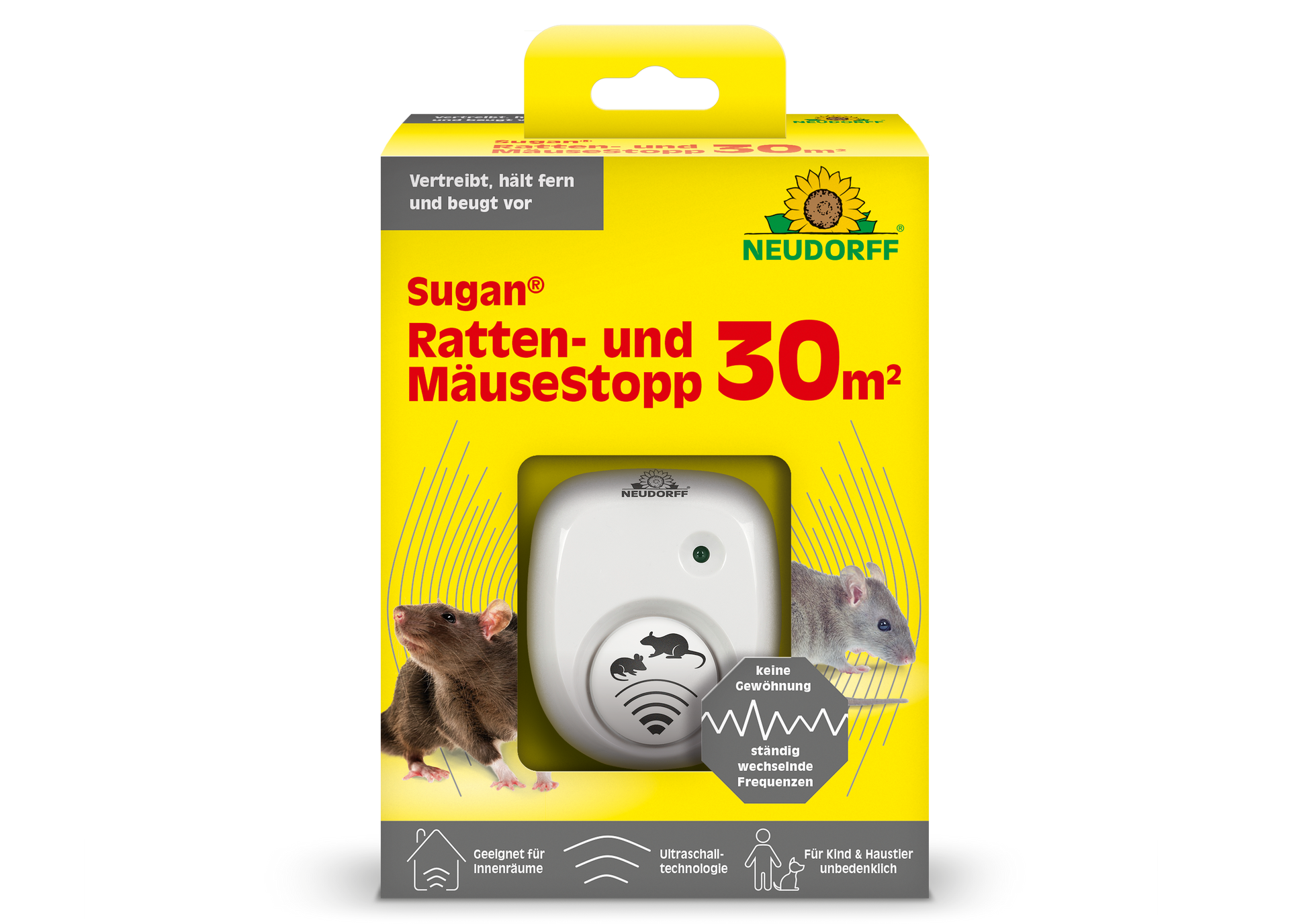 Sugan Ratten- und MäuseStopp vertreibt Ratten und Mäuse wirkungsvoll und dauerhaft aus Wohnräumen, Dachböden, Kellern und Garagen. Sugan Ratten- und MäuseStopp sendet variierende Ultraschallwellen aus, die insbesondere von Ratten und Mäusen als störend empfunden werden. Andere Nagetiere, wie Kaninchen, Hamster oder Meerschweinchen, können den Ultraschall ebenfalls wahrnehmen und beeinträchtigt werden. Deshalb sollten diese Tiere nicht im gleichen oder angrenzenden Räumen untergebracht sein.