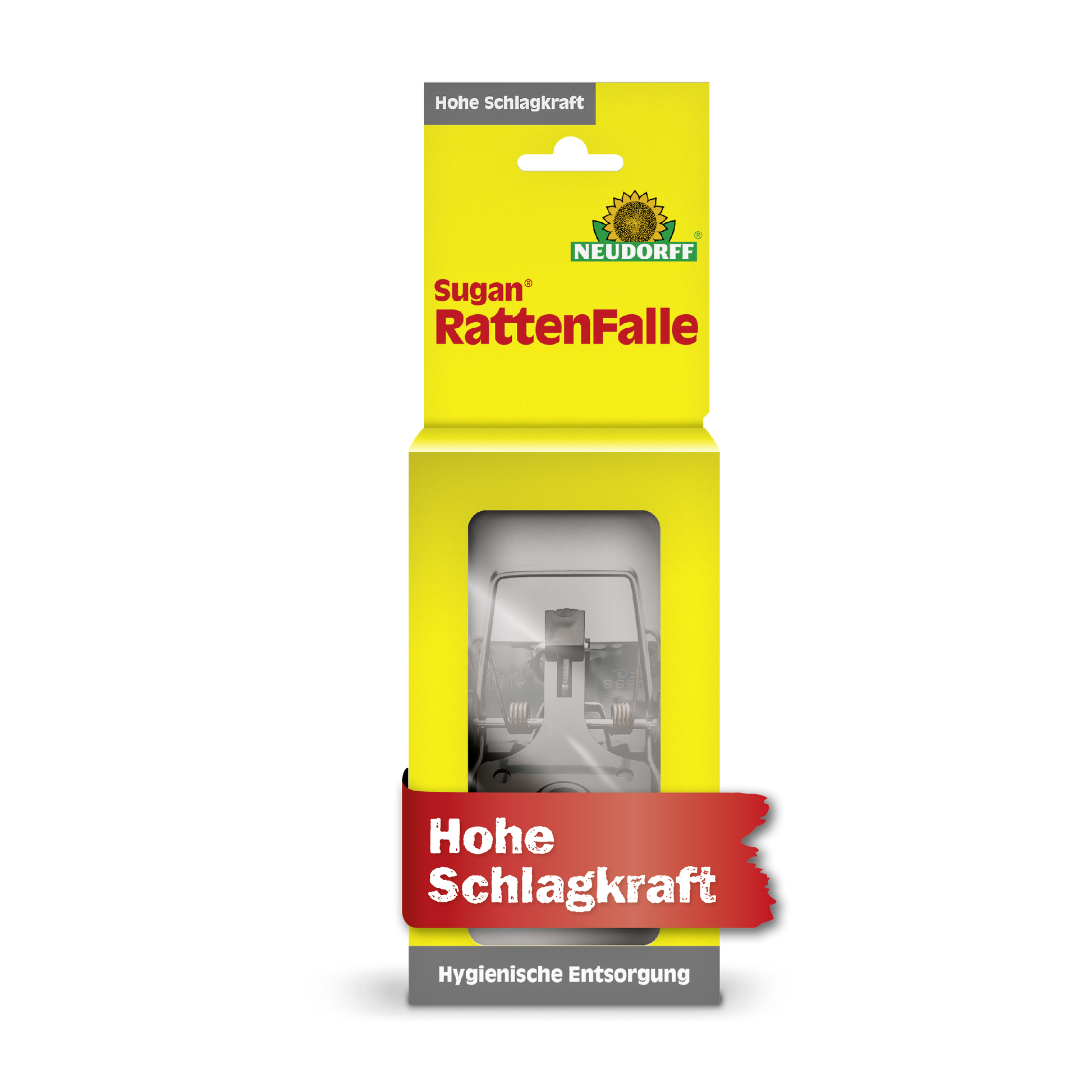Mit der Sugan RattenFalle bekämpfen Sie Ratten zuverlässig. Die aus Kunststoff und Stahl bestehende Falle lässt sich durch einfaches Herunterdrücken des Doppelbügels spannen. Der Schlagbügel löst sich automatisch durch einfaches Herunterdrücken des Spannbügels. Diese Mechanik ermöglicht ein besonders hygienisches Entfernen des toten Tieres ohne Berührung.