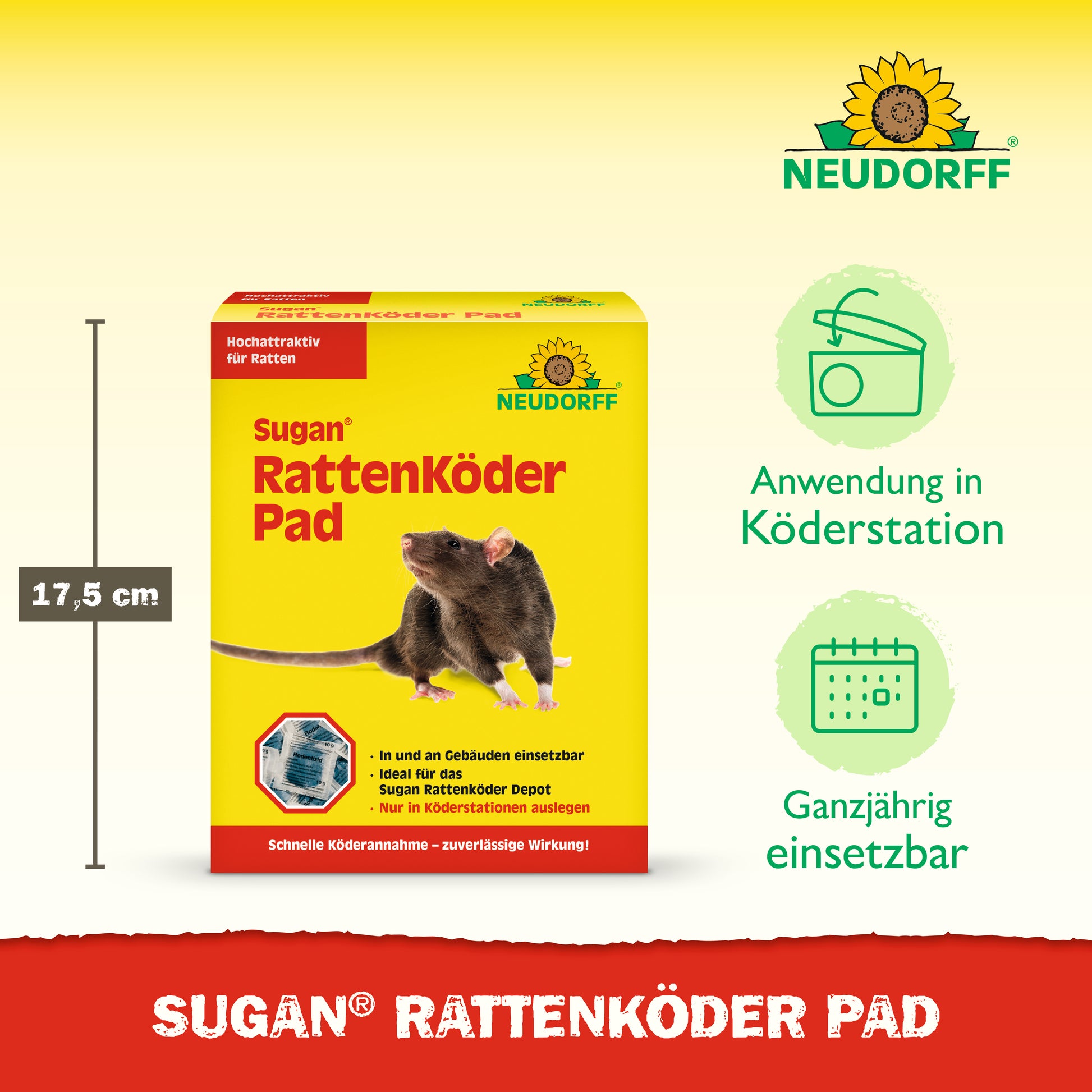 Die Sugan RattenKöder Pads enthalten den Blutgerinnungshemmstoff Coumatetralyl. Die Ratten nehmen den Köder mit der Nahrung über einige Tage auf. Die Zeitspanne zwischen der Köderaufnahme und dem Behandlungserfolg hängt von der aufgenommenen Ködermenge ab und beugt Misstrauen der Nager bei der Köderaufnahme vor. Nach 4 bis 6 Tagen verenden die Nagetiere. Die Köder enthalten Bitterstoffe gegen versehentliche Aufnahme.