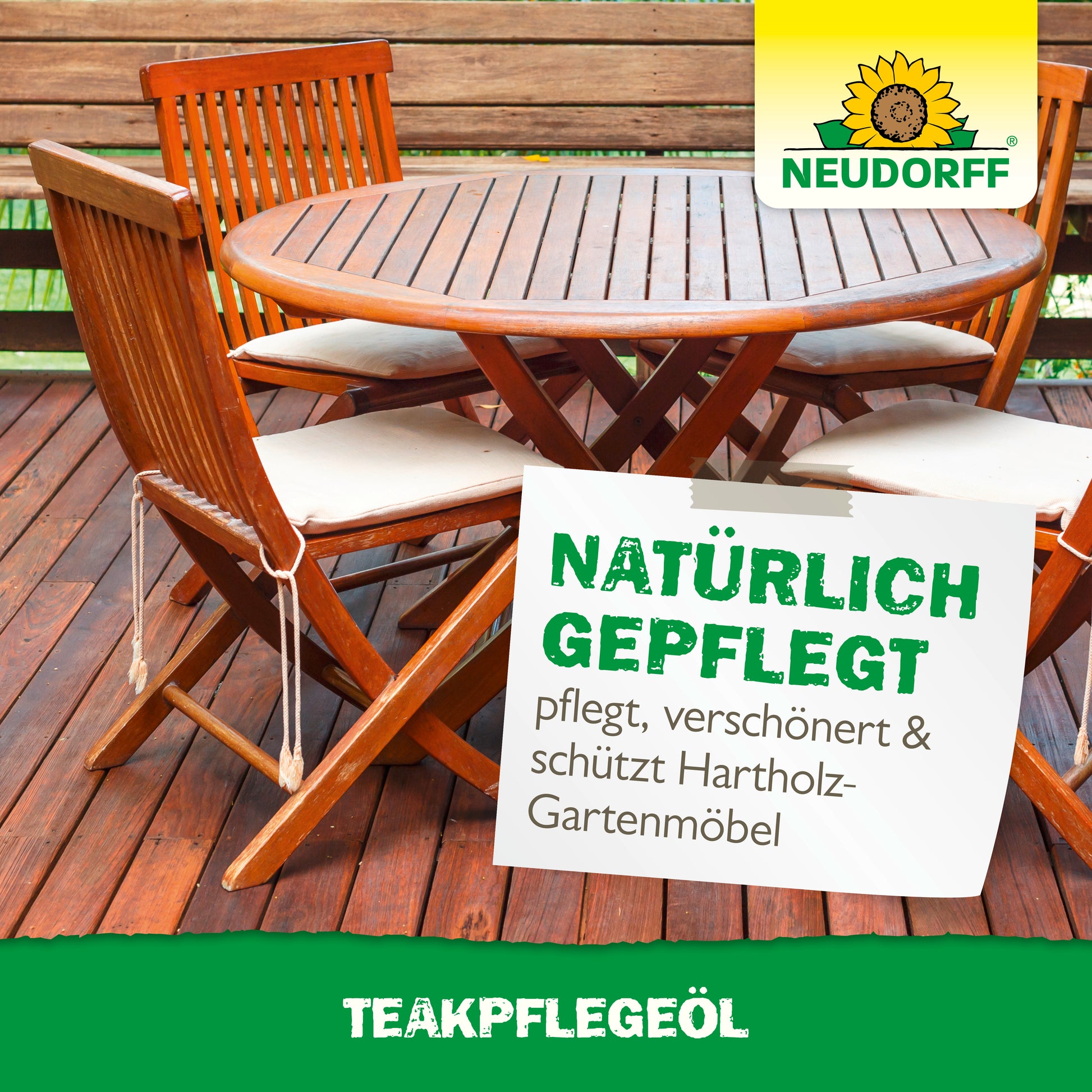 TeakPflegeÖl pflegt, verschönert und schützt Hartholz-Möbel. Die Holzoberflächen weisen nach der Behandlung Wasser ab und erhalten einen leicht seidigen Glanz. Die Holzmaserung wird betont. Das Pflegeöl ist eine farblose Spezialzubereitung mit hochwertigen pflanzlichen Rohstoffen, wie Leinöl, Holzöl und anderen Komponenten. TeakPflegeÖl ist zur Erstbehandlung genauso wie zur Nachpflege von witterungsbeständigen Hartholzmöbeln und -oberflächen wie Teak, Eukalyptus und Robinie geeignet. Sie können das TeakpflegeÖl auch zur Behandlung für Weichholzoberflächen (Kiefer, Fichte etc.) im Innenbereich verwenden. Schützen Sie Kinderspielzeug (DIN EN 71/3) aus Holz auch mit dem TeakpflegeÖl.
