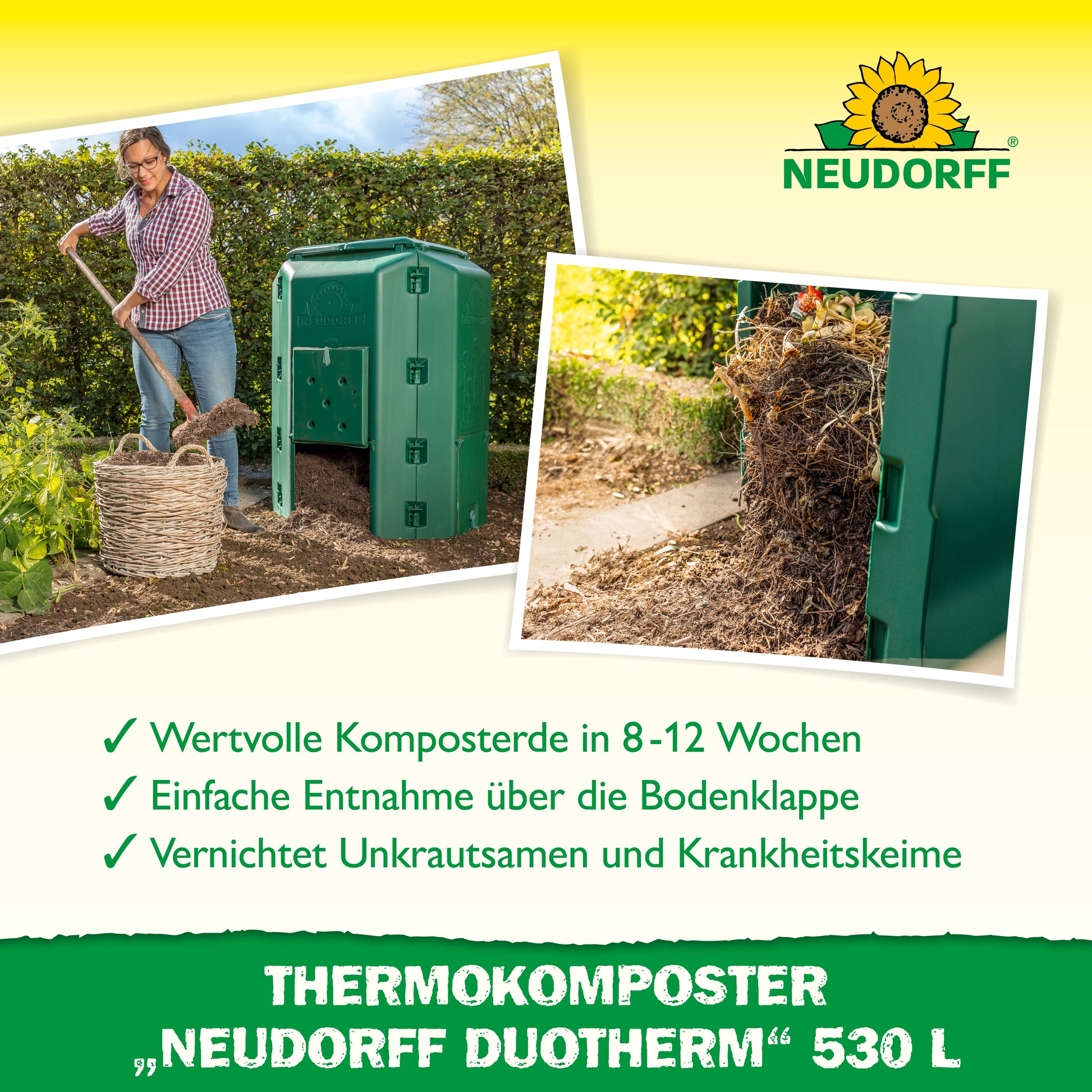 Der Thermokomposter „Neudorff DuoTherm“ 530 L kompostiert organische Garten- und Küchenabfälle innerhalb von zwei bis drei Monaten. Dann ist das pflanzliche Material soweit umgesetzt, dass es als nährstoffreicher Mulchkompost in den Kreislauf des Gartens zurückgegeben werden kann. Entscheidend für eine schnelle und gleichmäßige Verrottung organischer Rohmaterialien ist die sorgfältige Zerkleinerung und Durchmischung. Mischen Sie feines Material, wie z. B. Rasenschnitt, mit gröberem wie z. B. geschredderten Ästen oder kleingeschnittenen Pflanzenstängeln. Durch die doppelwandige Thermo-Konstruktion können Verrottungstemperaturen von 70° C entstehen, bei denen auch gleich die meisten Unkrautsamen und Krankheitskeime vernichtet werden. Der Thermokomposter „Neudorff DuoTherm“ 530 L benötigt ca. 1 m² Stellfläche und ist damit auch sehr gut für kleine Gärten geeignet. Um zu verhindern, dass Mäuse und andere Nagetiere aus dem Erdreich in den Komposter gelangen, empfehlen wir die Verwendung unseres Mäusegitters.