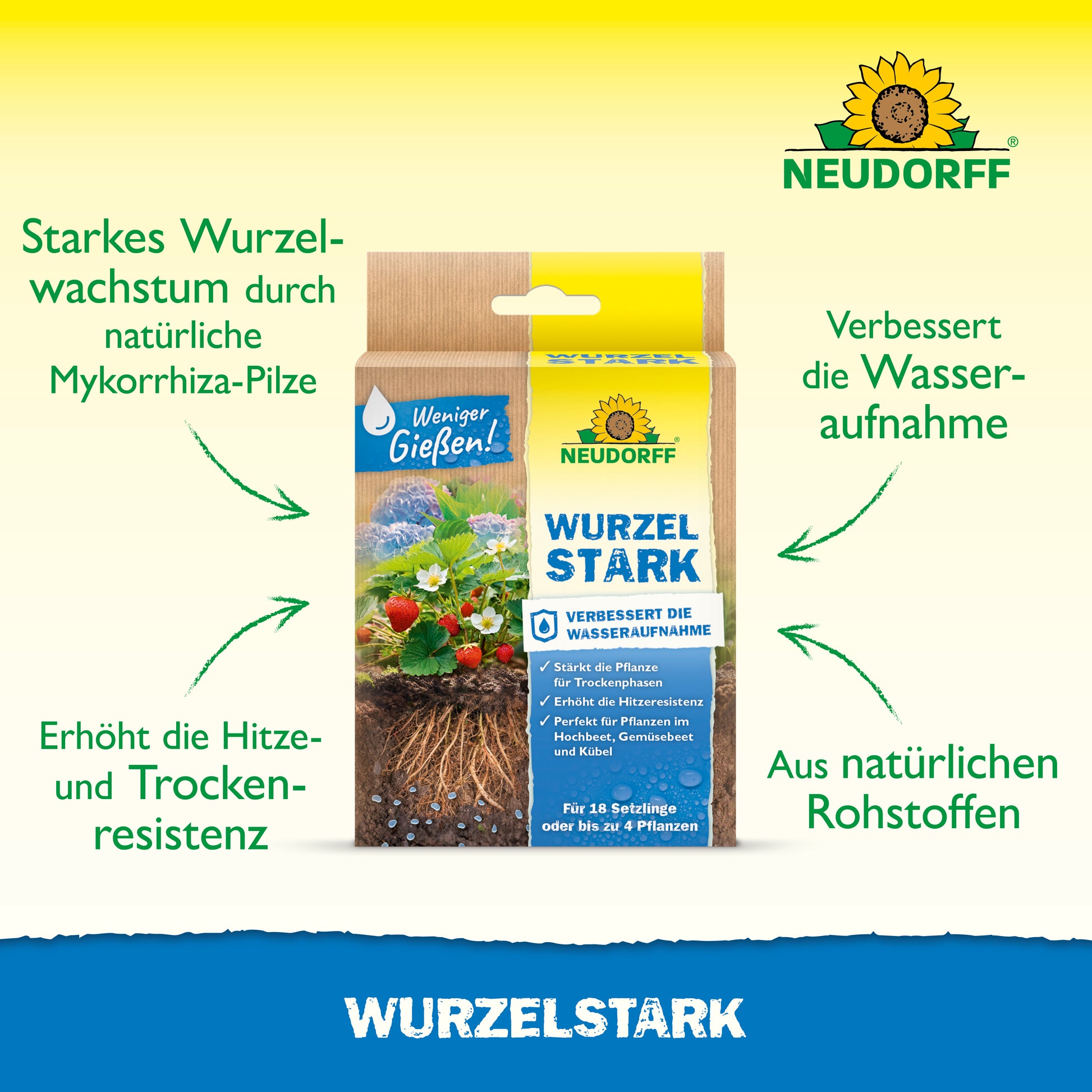 Wurzelstark ist ein natürlicher Wurzelaktivator mit Mykorrhiza-Pilzen, die sich an den Wurzeln der Pflanzen setzen und die Wurzeloberfläche vergrößern. Dadurch werden auch in Trockenperioden zusätzliche Wasserreserven im Boden erschlossen, die sonst nicht erreicht werden können, was eine reiche Ernte und Blüte auch in heißen Sommern fördert.
